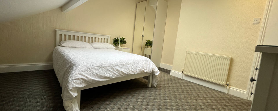 Ground floor front double room with large bay window and Built-in Wardrobe, drawer unit, bedside & double bed.